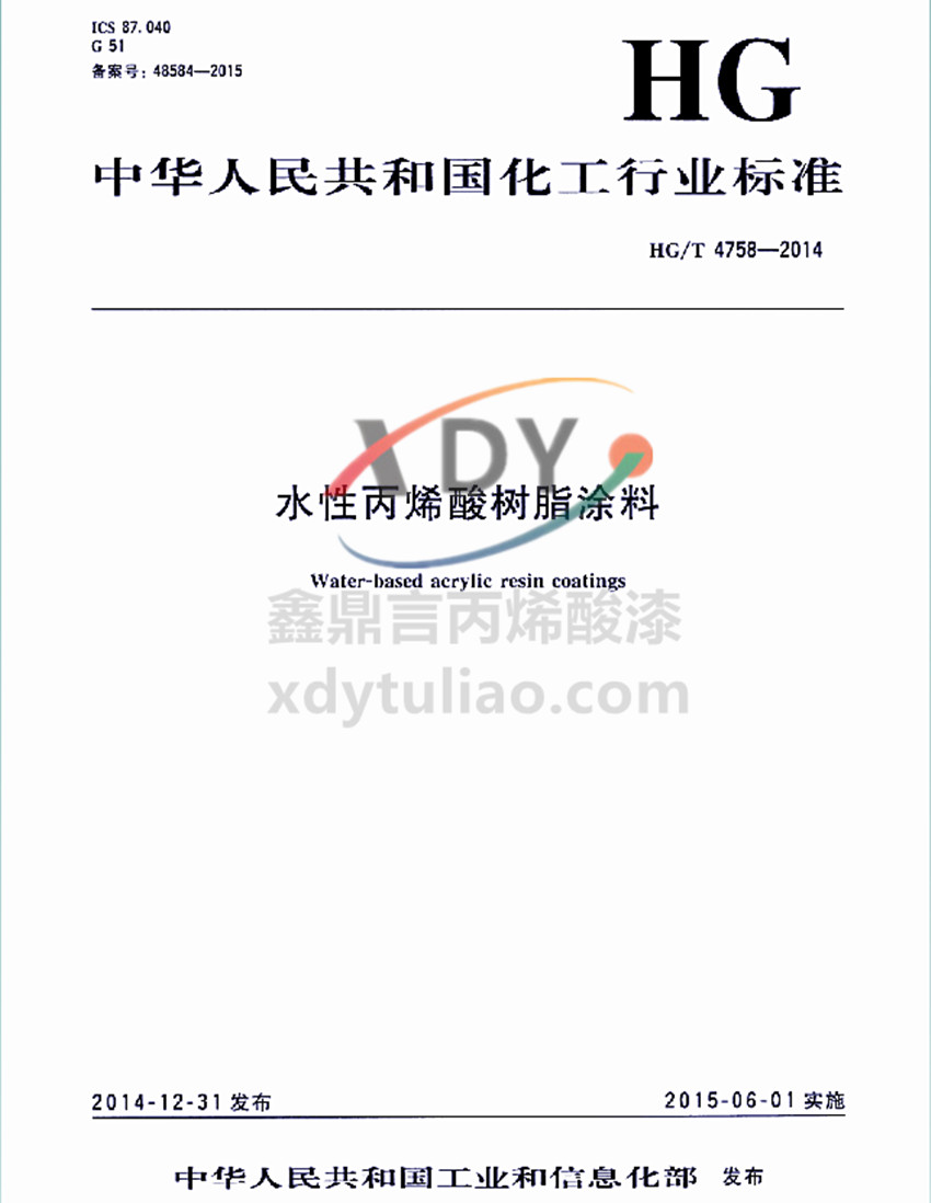 水性丙烯酸樹脂涂料化工行業標準HG/T 4758-2014 中華人民共和國化工行業標準 水性丙烯酸樹脂涂料Water-based acrylic resin coatings 2014-12-31發布 2015-06-01實施 中華人民共和國工業和信息化部 發布 本標準規定了水性丙烯酸樹脂涂料的產品分類、要求、試驗方法、檢驗規則、標志、包裝和貯存等。本標準適用于以水性丙烯酸樹脂為主要成膜物的水性單