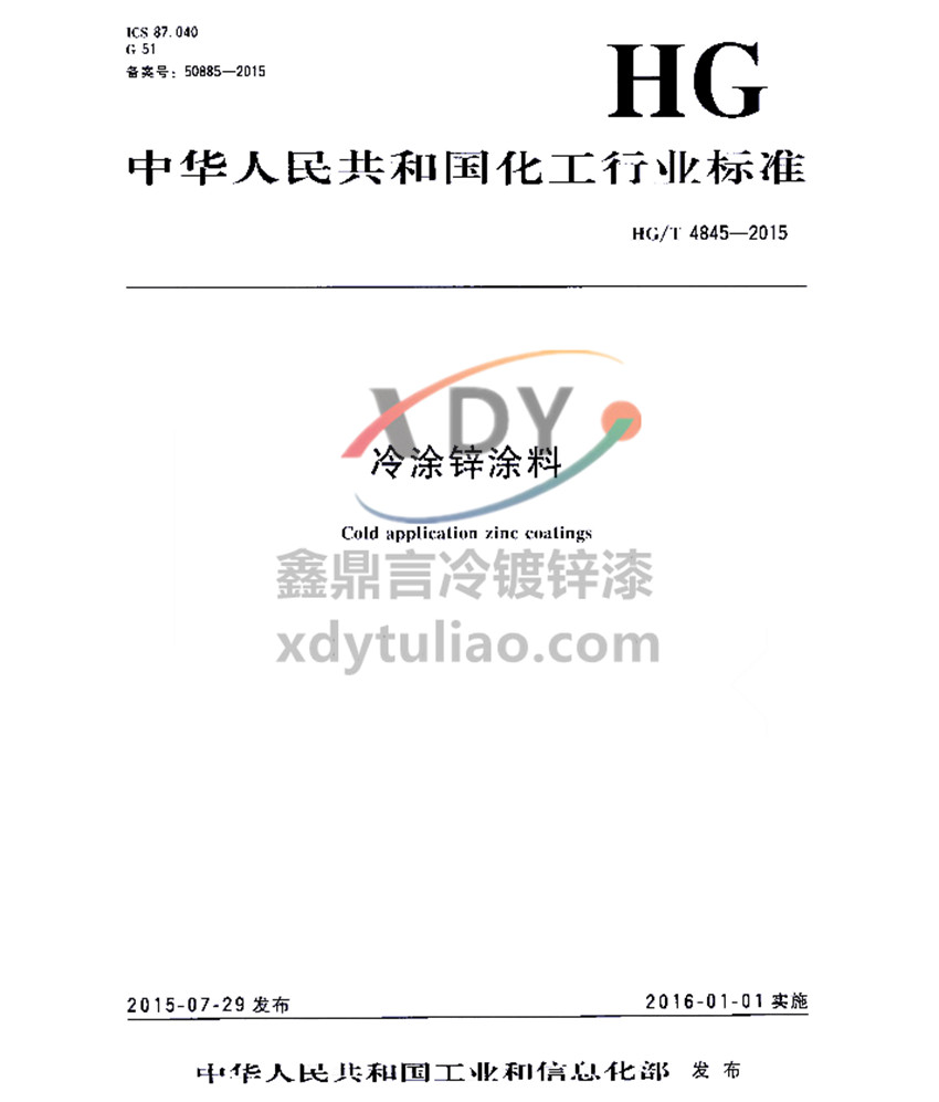 HG/T 4845-2015冷涂鋅涂料標(biāo)準(zhǔn) 備案號(hào):50885-2015 中華人民共和國(guó)化工行業(yè)標(biāo)準(zhǔn) HG/T 4845-2015 冷涂鋅涂料Cold application zinc coatings 2015-07-29發(fā)布 2016-01-01實(shí)施 中華人民共和國(guó)工業(yè)和信息化部發(fā)布 本標(biāo)準(zhǔn)適用于常溫施涂的高鋅含量的有機(jī)涂料。該產(chǎn)品是由鋅粉、有機(jī)樹脂、溶劑等組成的單組分涂料,主要用于鋼鐵底材暴