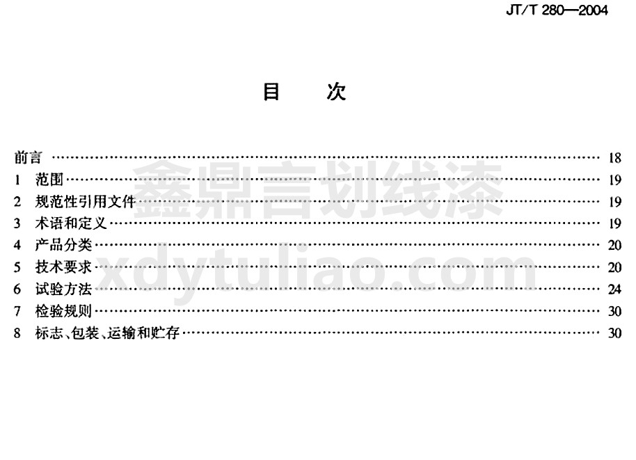JT/T 280-2004路面標線涂料標準是小編照搬JT/T 280-2004《路面標線涂料》紙質版內容,大家可以放心參考。更多防腐涂料執行國家和行業標準等防腐涂料相關信息可以參與網站:www.mokuba.com.cn