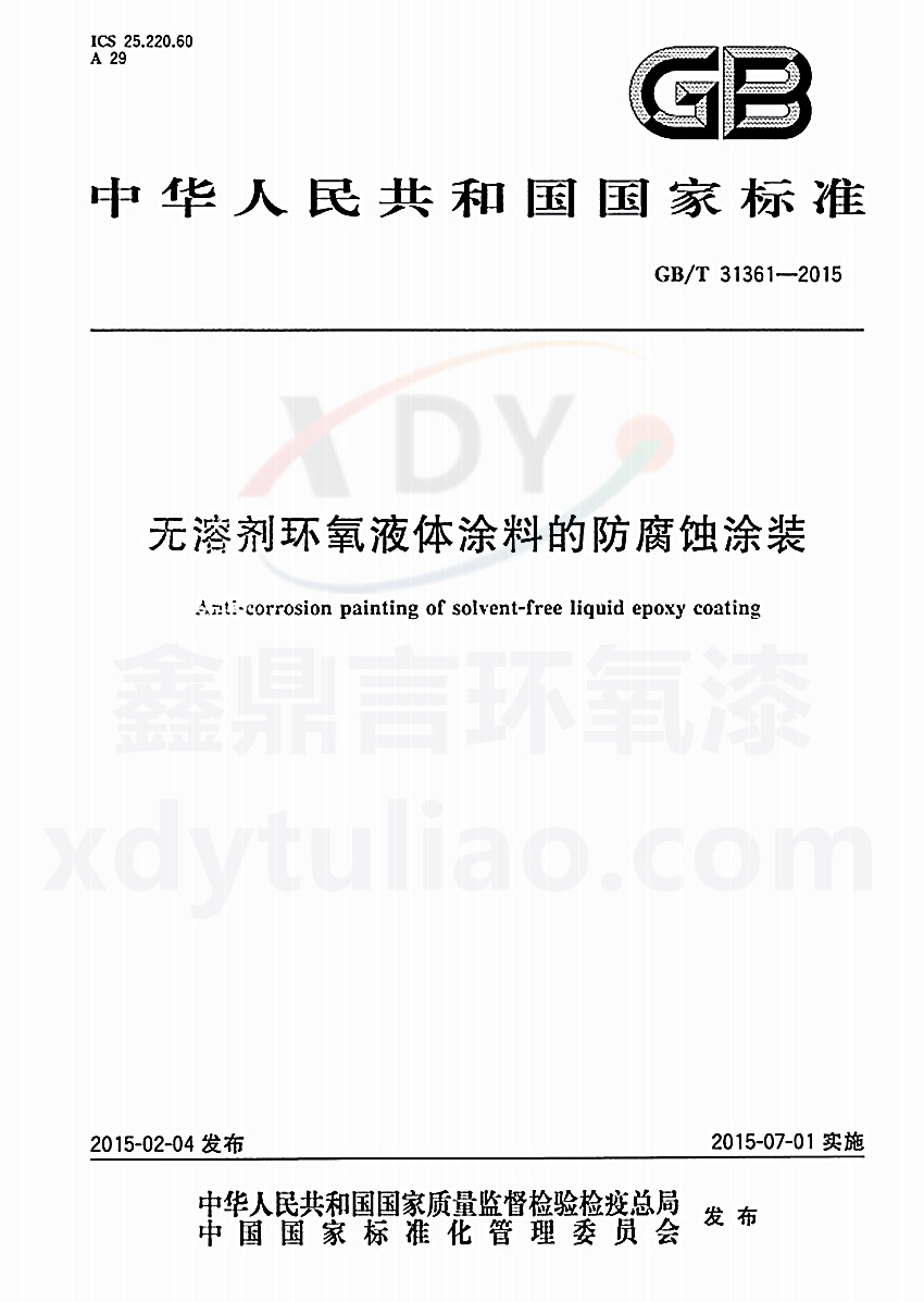 GB/T 31361-2015無溶劑環(huán)氧液體涂料的防腐蝕涂裝標(biāo)準(zhǔn) ICS25.220.60 A29 GB 中華人民共和國(guó)國(guó)家標(biāo)準(zhǔn) GB/T 31361-2015 無溶劑環(huán)氧液體涂料的防腐蝕涂裝anti-corrosion painting of solvent-free liquid epoxy coating 2015-02-04發(fā)布 2015-07-01實(shí)施 中華人民共和國(guó)國(guó)家質(zhì)量監(jiān)督檢驗(yàn)檢
