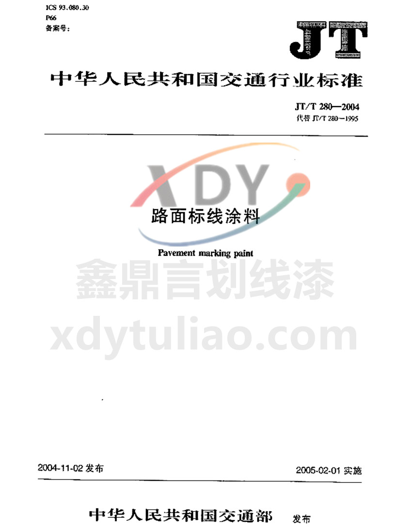 JT/T 280-2004路面標(biāo)線涂料標(biāo)準(zhǔn)是防腐涂料小編照搬JT/T 280-2004《路面標(biāo)線涂料》紙質(zhì)版內(nèi)容,大家可以放心參考。更多防腐涂料執(zhí)行國家和行業(yè)標(biāo)準(zhǔn)等防腐涂料相關(guān)信息可以參考官網(wǎng):www.mokuba.com.cn ICS 93.080.30 P66 JT 中華人民共和國交通運(yùn)輸行業(yè)標(biāo)準(zhǔn) JT/T 280-2004路面標(biāo)線涂料Pavement