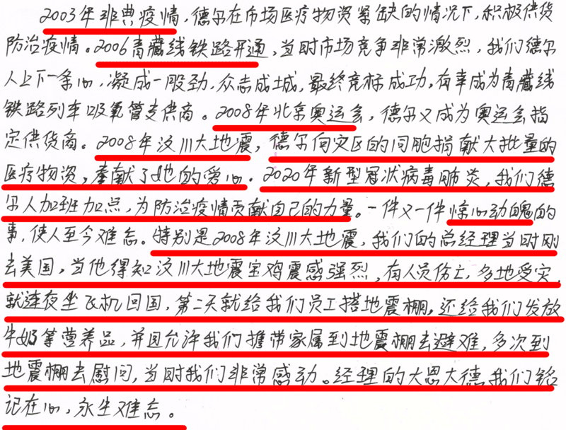 2008年,對于我們每一個中國人,是不平凡不同尋常的一年,也是沉痛的一年,更是難忘的一年。那年發(fā)生了震驚世界的5.12汶川大地震。那幾天電視天天報道災(zāi)難帶來的不幸,以致每天心懷悲痛的看著電視上的傷亡情況。一次無意識的看電視機會,我看到了寶雞電視臺采訪我家張華總經(jīng)理,我激動的喊我父母過來看,因時間久遠(yuǎn)具體記得不太清楚了。但講述的內(nèi)容至今歷歷在目。是張總經(jīng)理以德爾公司總經(jīng)理的身份為我們四川受災(zāi)同胞捐款的事跡。當(dāng)時高三的我就覺得這是很偉大的愛國情懷和忘我無私的愛國情操,心系受災(zāi)群眾,為國家為人民貢獻(xiàn)自己的力量。讓多日以來沉重的心情受到些許的感動與溫暖。災(zāi)難無情,人間有愛,希望就在眼前!
