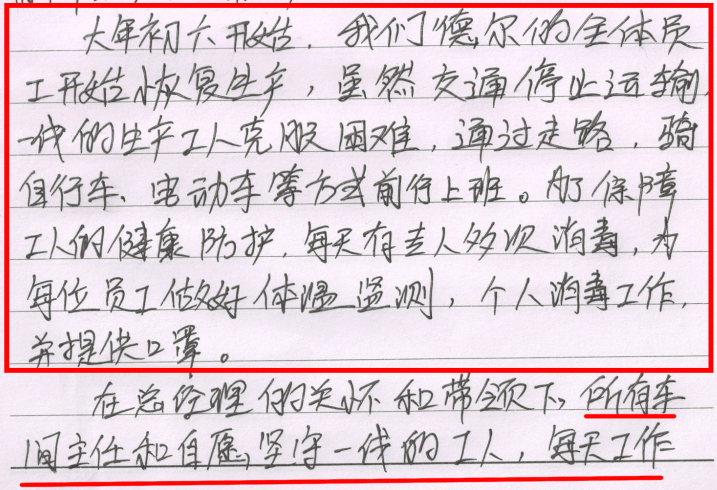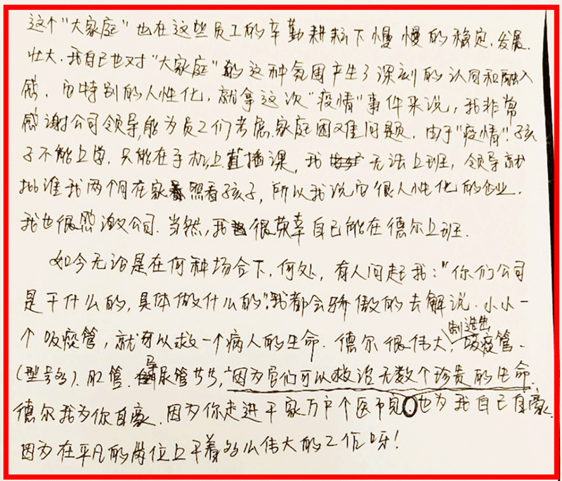 今年是特別的一年,是全國人民最難忘的一年。由于疫情的原因,許多醫(yī)務(wù)工作者和企業(yè)都在奉獻自己的微薄力量去抗擊疫情。德爾作為醫(yī)療企業(yè)同時也承擔(dān)了自己的企業(yè)責(zé)任。過年期間,公司在保障員工自己安全,同時生產(chǎn)了許多醫(yī)療器械,救助那些不幸被傳染的患者。讓我最感動是,過年期間由于疫情的原因交通也不方便,同事還有他們的家人用自己的車來接送我回家,后來經(jīng)理也用自己的車接公司的員工回家,這讓我感受到德爾大家庭的溫暖。